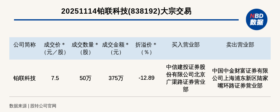 每經(jīng)訊,2025年11月14日,新三板創(chuàng)新層公司鉑聯(lián)科技(838192,收盤價(jià):8.61元)發(fā)生一筆大宗交易,成交價(jià)7.5元/股,成交數(shù)量50萬股,成交金額375萬元,折價(jià)12.89%。買入營(yíng)業(yè)部是中信建投證券股份有限公司北京廣渠路證券營(yíng)業(yè)部,賣出營(yíng)業(yè)部是中國(guó)中金財(cái)富證券有限公司上海浦東新區(qū)陸家嘴環(huán)路證券營(yíng)業(yè)部。