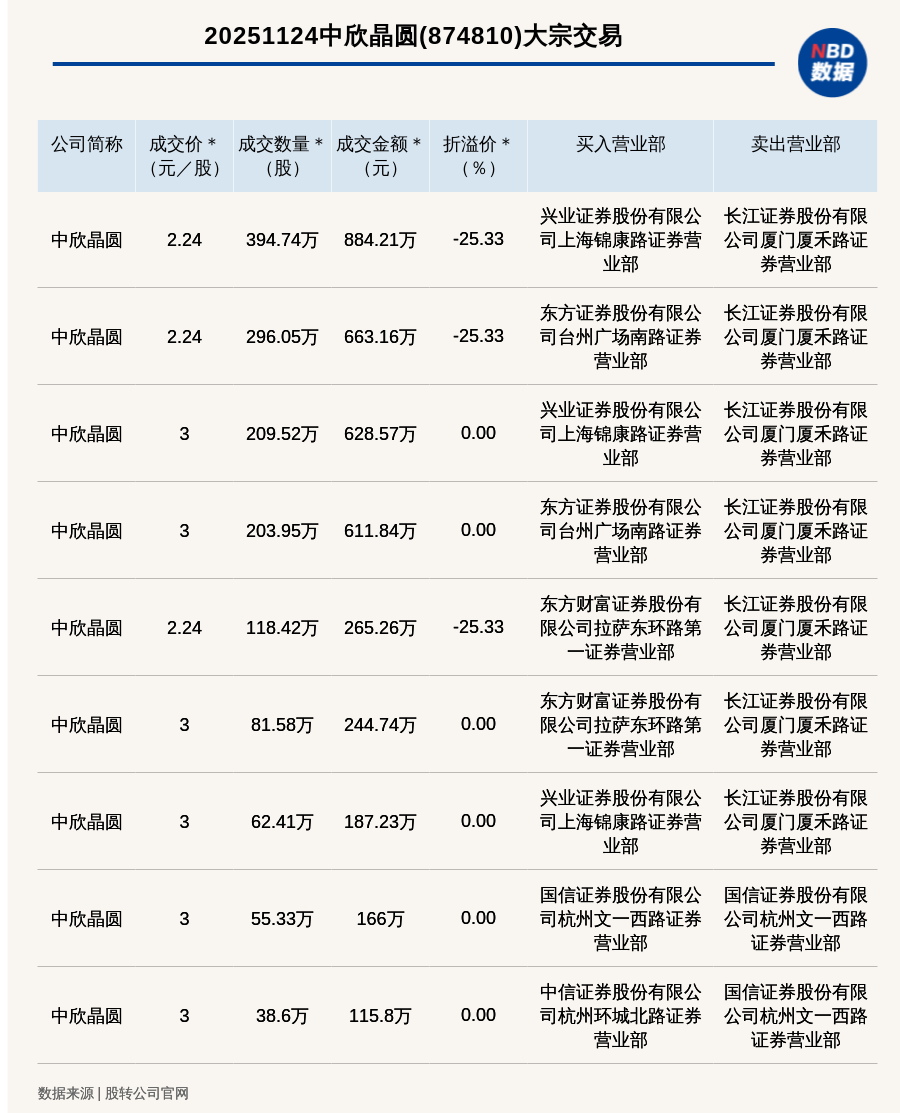 每經(jīng)訊,2025年11月24日,新三板創(chuàng)新層公司中欣晶圓(874810,收盤價(jià):3元)發(fā)生9筆大宗交易,總成交金額為3766.8萬元,成交金額最高的一筆成交價(jià)2.24元/股,成交數(shù)量394.74萬股,成交金額884.21萬元,折價(jià)25.33%。買入營業(yè)部是興業(yè)證券股份有限公司上海錦康路證券營業(yè)部,賣出營業(yè)部是長江證券股份有限公司廈門廈禾路證券營業(yè)部。