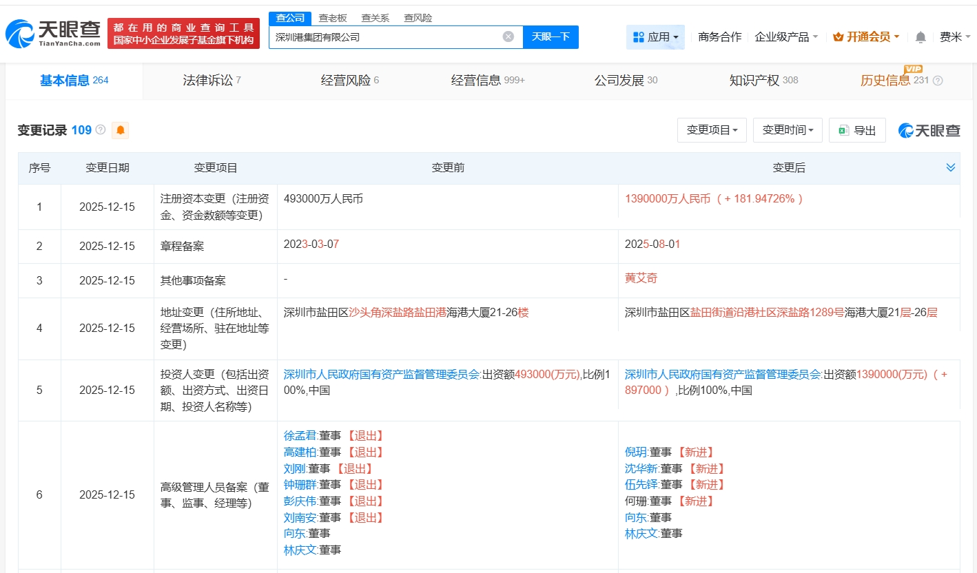 每經(jīng)AI快訊,天眼查App顯示,近日,深圳港集團(tuán)有限公司發(fā)生工商變更,注冊資本由49.3億元人民幣增至139億元人民幣,增幅約182%,同時(shí),多位高管發(fā)生變更。該公司成立于1985年2月,法定代表人為胡朝陽,經(jīng)營范圍包括投資、開發(fā)建設(shè)和經(jīng)營管理鹽田港區(qū)、大鏟灣港區(qū)、國內(nèi)外其他港口及港口后方陸域等,由深圳市人民政府國有資產(chǎn)監(jiān)督管理委員會全資持股。