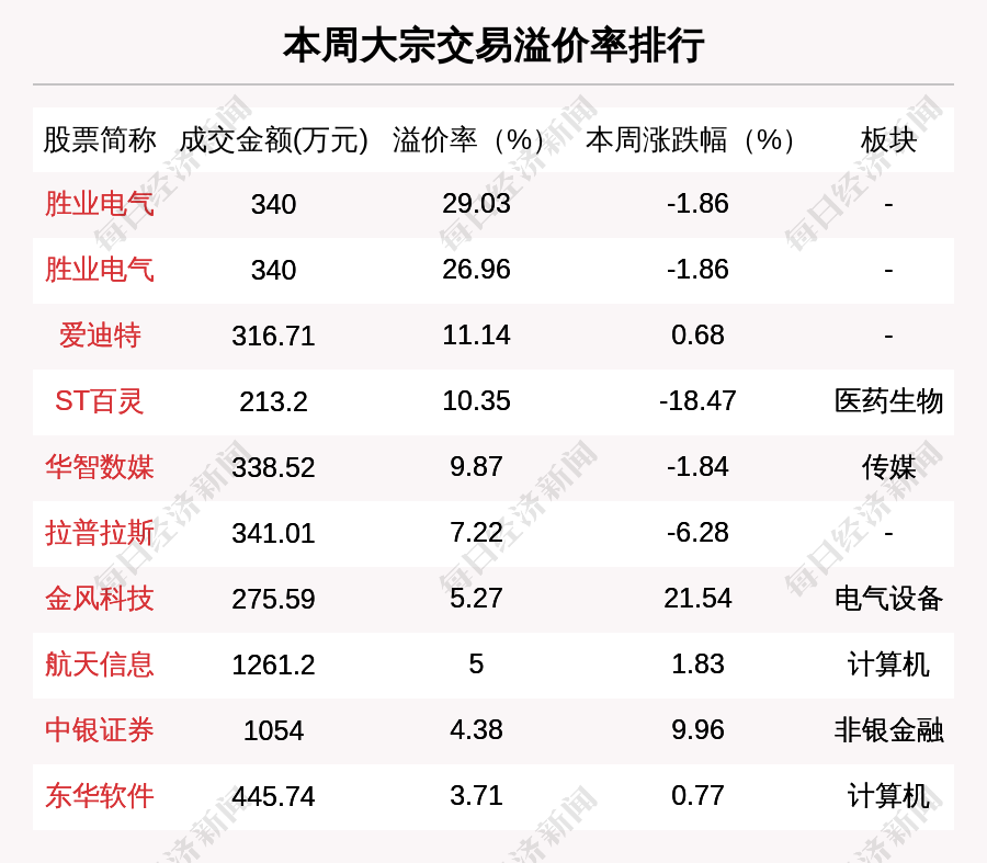 溢價(jià)交易方面,本周有4筆大宗交易溢價(jià)率超過10%。