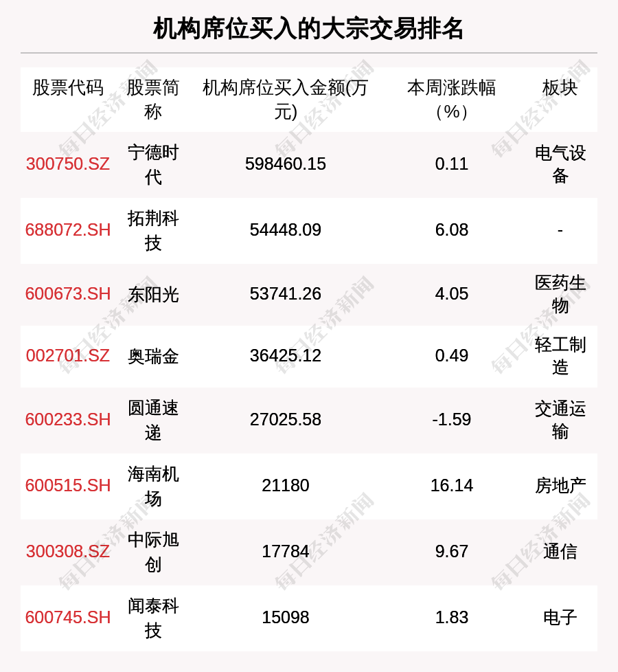 本周機(jī)構(gòu)專用席位參與了332筆大宗交易,環(huán)比上周減少18筆。本周機(jī)構(gòu)席位買入金額前3的公司為寧德時(shí)代、拓荊科技、東陽光,機(jī)構(gòu)買入金額分別為59.85億元、5.44億元、5.37億元。