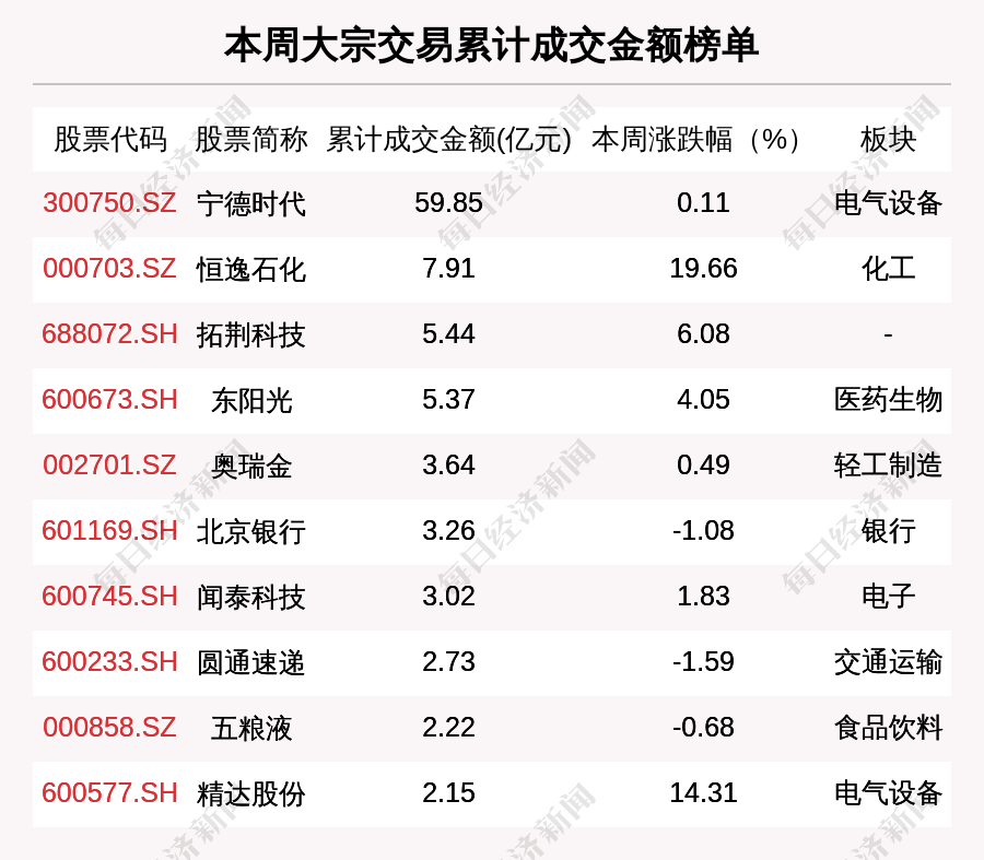 本周大宗交易累計(jì)成交金額前3的公司是寧德時(shí)代、恒逸石化、拓荊科技,累計(jì)成交金額分別為59.85億元,7.91億元,5.44億元。