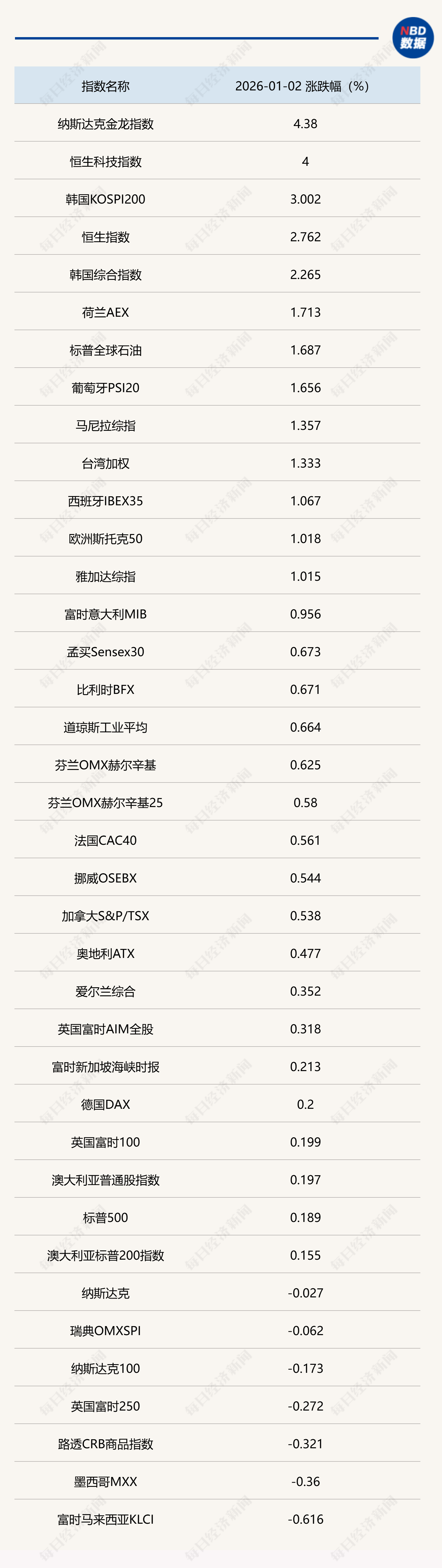 1月2日,全球股市迎來2026年首個交易日,亞洲市場表現(xiàn)強勁,歐洲市場,美國市場則相對低迷。其中,納斯達克金龍指數(shù)、恒生科技指數(shù)當天分別大漲4.38%、4%,領漲全球主要股指。