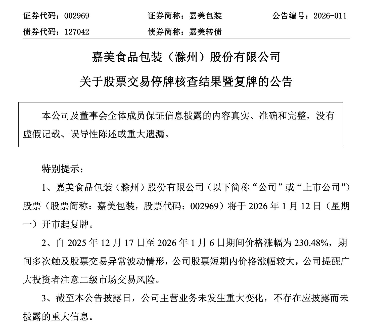 1月11日,嘉美包裝(002969.SZ)公告稱,停牌期間,公司就股票交易波動(dòng)情況進(jìn)行了核查。鑒于相關(guān)核查工作已完成,根據(jù)相關(guān)規(guī)定,經(jīng)申請,公司股票將于年1月12日開市起復(fù)牌。自2025年12月17日至2026年1月6日期間價(jià)格漲幅為230.48%,期間多次觸及股票交易異常波動(dòng)情形,公司股票短期內(nèi)價(jià)格漲幅較大,公司提醒廣大投資者注意二級(jí)市場交易風(fēng)險(xiǎn)。逐越鴻智不存在未來12個(gè)月內(nèi)改變上市公司主營業(yè)務(wù)或?qū)ι鲜泄局鳡I業(yè)務(wù)進(jìn)行重大調(diào)整的計(jì)劃;不存在未來12個(gè)月內(nèi)對(duì)上市公司或其子公司的資產(chǎn)和業(yè)務(wù)進(jìn)行出售、合并、與他人合資或合作、或上市公司擬購買或置換資產(chǎn)的計(jì)劃;不存在未來36個(gè)月內(nèi)通過上市公司借殼上市的計(jì)劃或安排。