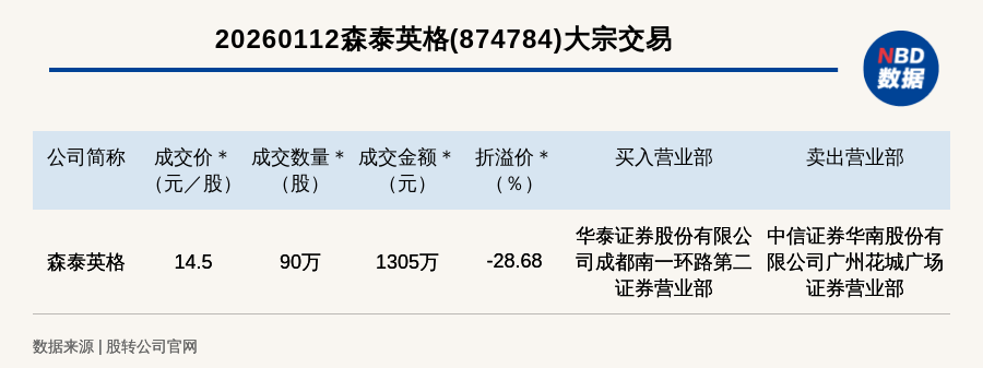 每經(jīng)訊,2026年1月12日,新三板基礎(chǔ)層公司森泰英格(874784,收盤價(jià):20.33元)發(fā)生一筆大宗交易,成交價(jià)14.5元/股,成交數(shù)量90萬(wàn)股,成交金額1305萬(wàn)元,折價(jià)28.68%。買入營(yíng)業(yè)部是華泰證券股份有限公司成都南一環(huán)路第二證券營(yíng)業(yè)部,賣出營(yíng)業(yè)部是中信證券華南股份有限公司廣州花城廣場(chǎng)證券營(yíng)業(yè)部。