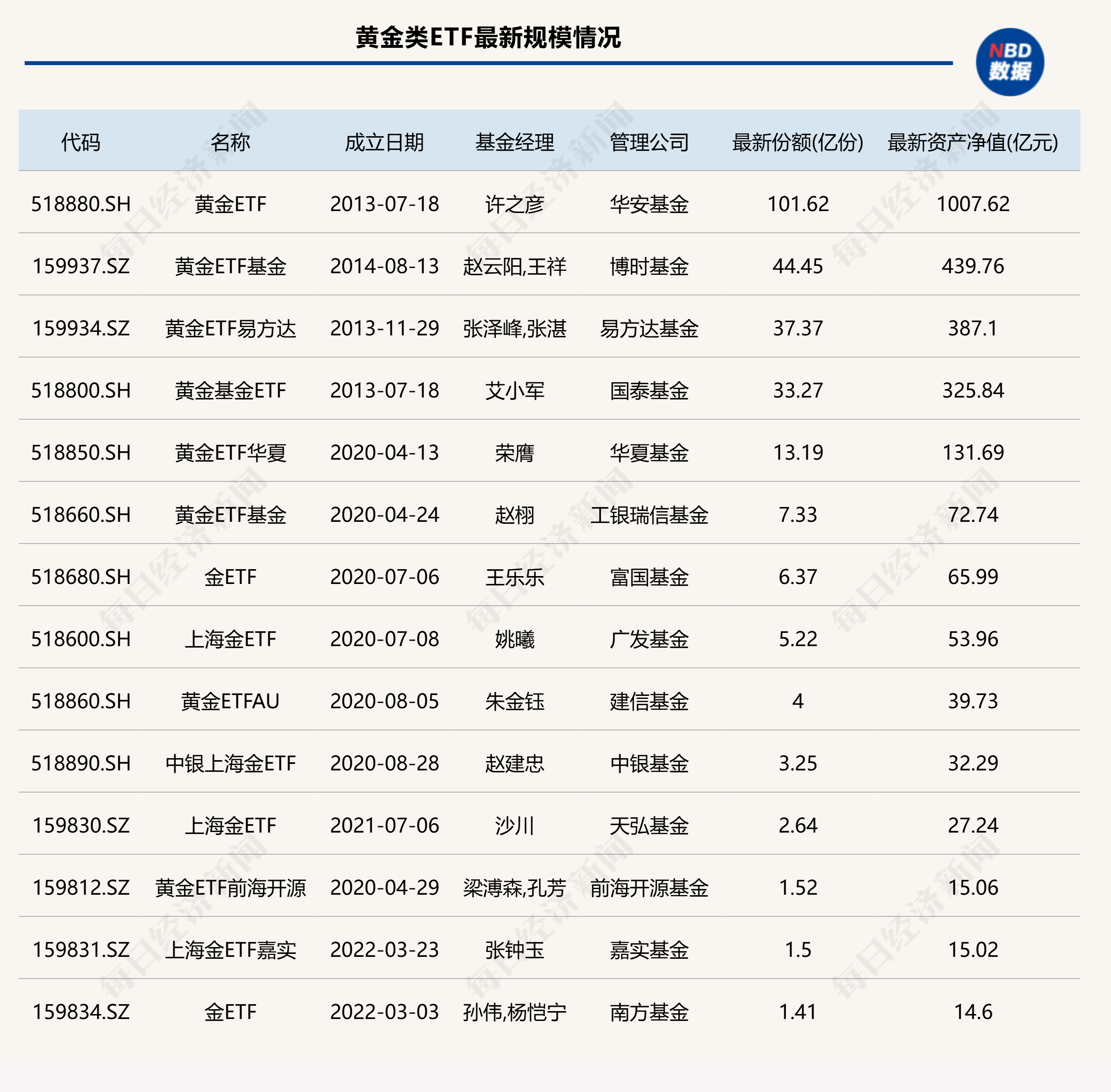 Wind數(shù)據(jù)顯示,目前全市場共有5只百億元級的黃金ETF,分別是華安黃金ETF(1007.62億元)、博時黃金ETF(439.76億元)、黃金ETF易方達(387.10億元)、國泰黃金ETF(325.84億元)和黃金ETF華夏(131.69億元)。