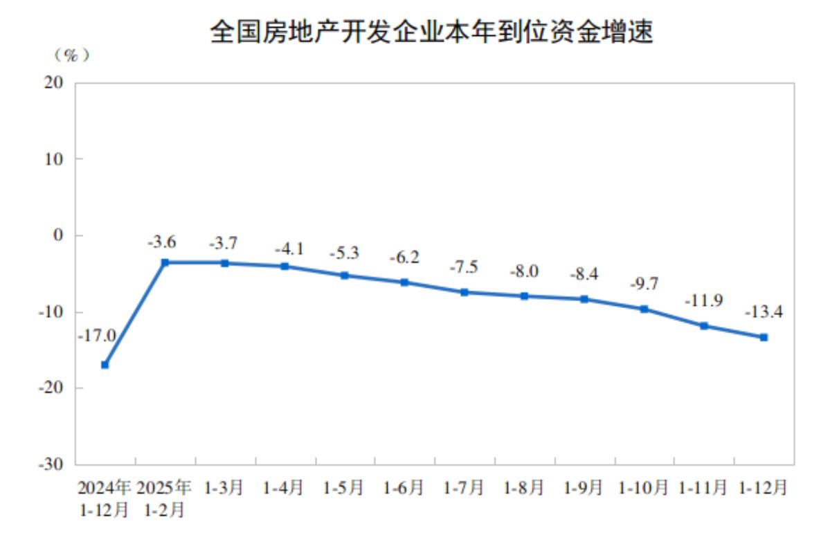 2025年,房地產(chǎn)開發(fā)企業(yè)房屋施工面積659890萬平方米,比上年下降10.0%。其中,住宅施工面積460123萬平方米,下降10.3%。從企業(yè)到位資金情況來看,2025年房地產(chǎn)開發(fā)企業(yè)到位資金93117億元,比上年下降13.4%。
