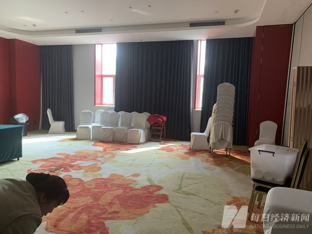 記者到達時,現(xiàn)場僅有一名保潔人員蹲在紅黃花紋的地毯上工作,長條桌旁散落著幾張備用椅子。