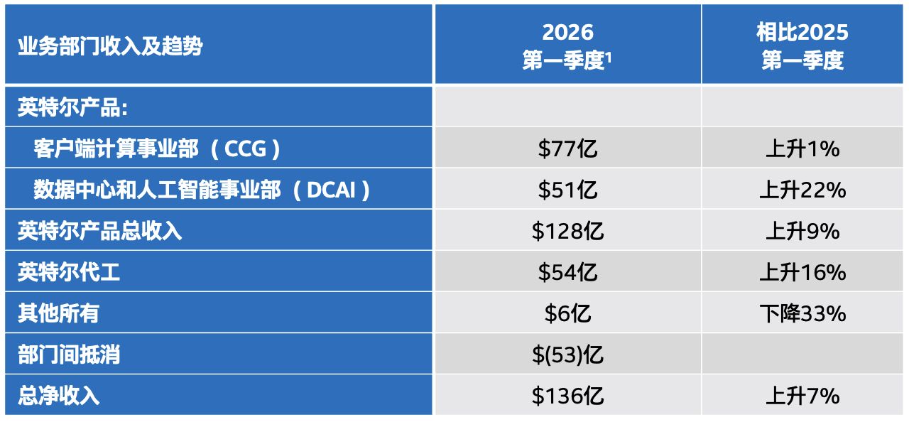 財(cái)報(bào)數(shù)據(jù)顯示,英特爾一季度總營(yíng)收達(dá)136億美元,同比增長(zhǎng)7%,大幅跑贏華爾街預(yù)期,也超過了英特爾此前的預(yù)期——在披露2025年財(cái)報(bào)時(shí),英特爾給出的2026年第一季度營(yíng)收預(yù)期為117億美元至127億美元之間。