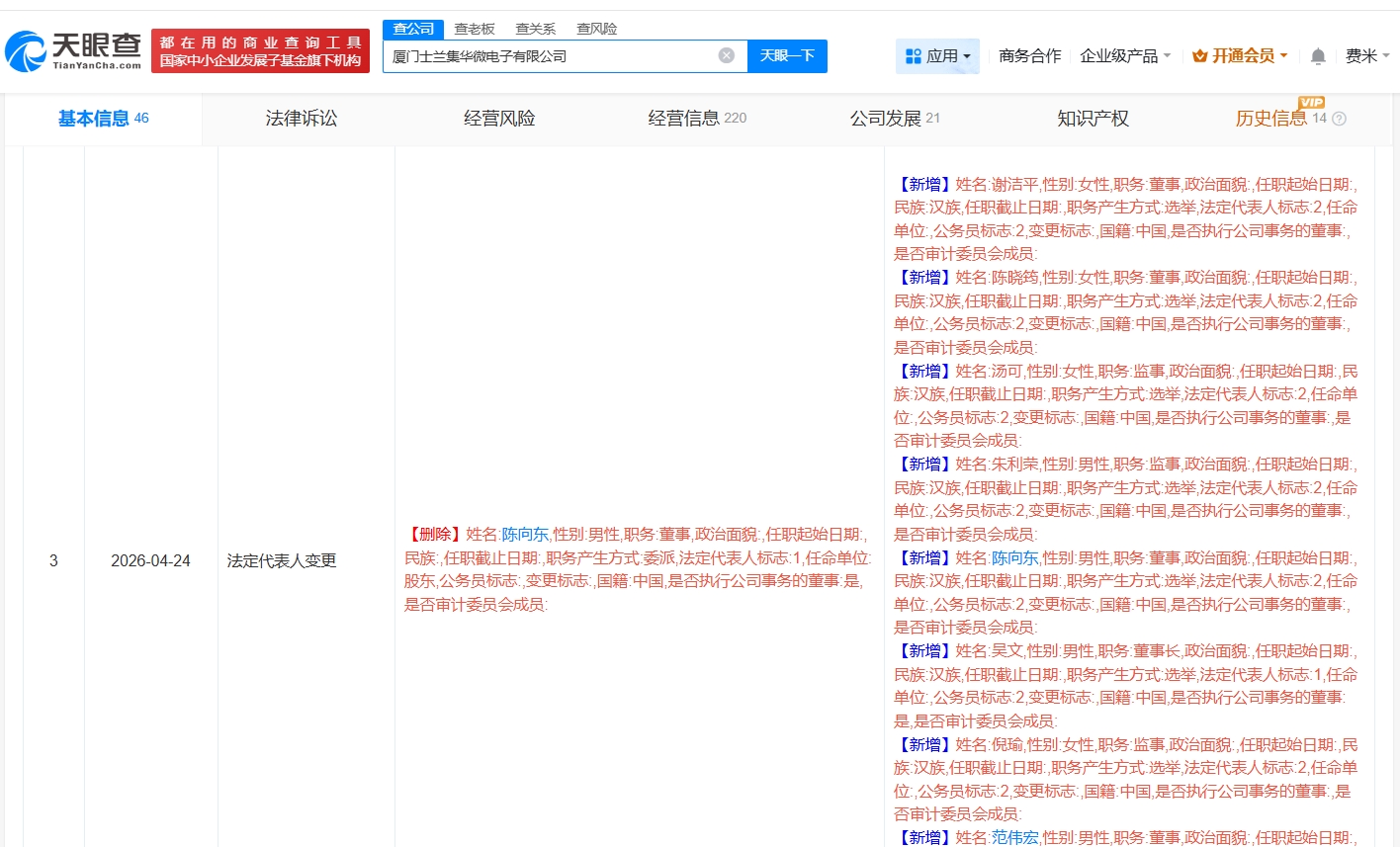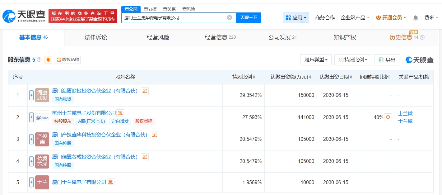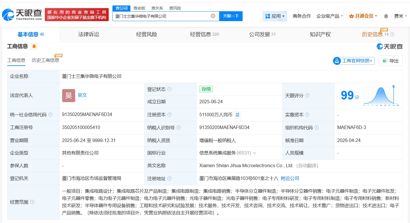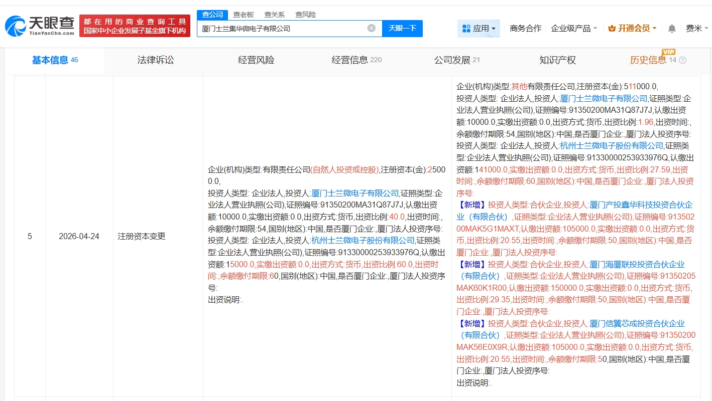 每經AI快訊,天眼查App顯示,近日,廈門士蘭集華微電子有限公司發(fā)生工商變更,新增廈門海廈聯投投資合伙企業(yè)(有限合伙)、廈門產投鑫華科技投資合伙企業(yè)(有限合伙)等為股東,陳向東卸任法定代表人,由吳文接任,同時,注冊資本由2.5億元人民幣增至51.1億元人民幣,增幅1944%。該公司成立于2025年6月,經營范圍包括集成電路設計、集成電路芯片及產品制造、集成電路銷售等,現由士蘭微(600460)、廈門士蘭微電子有限公司及上述新增股東共同持股。
