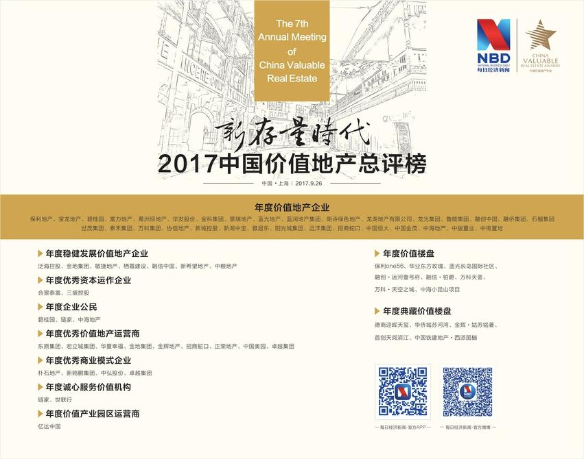 中國價值地產(chǎn)總評榜 2017中國價值地產(chǎn)總評榜“頒獎活動將與2017年9月26日的第七屆中國價值地產(chǎn)年會同日舉行,旨在給予地產(chǎn)行業(yè)企業(yè)、項(xiàng)目以公正、客觀的評價,并對優(yōu)秀企業(yè)及項(xiàng)目授予榮譽(yù)。 中國價值地產(chǎn)總評榜評選體系以總積分制排名,將第三方數(shù)據(jù)、上市公司市值、活躍指數(shù)、輿情、社會價值等方面進(jìn)行綜合評價,充分考慮每一家地產(chǎn)企業(yè)的價值呈現(xiàn),為行業(yè)的價值規(guī)范提供有效的指標(biāo)。