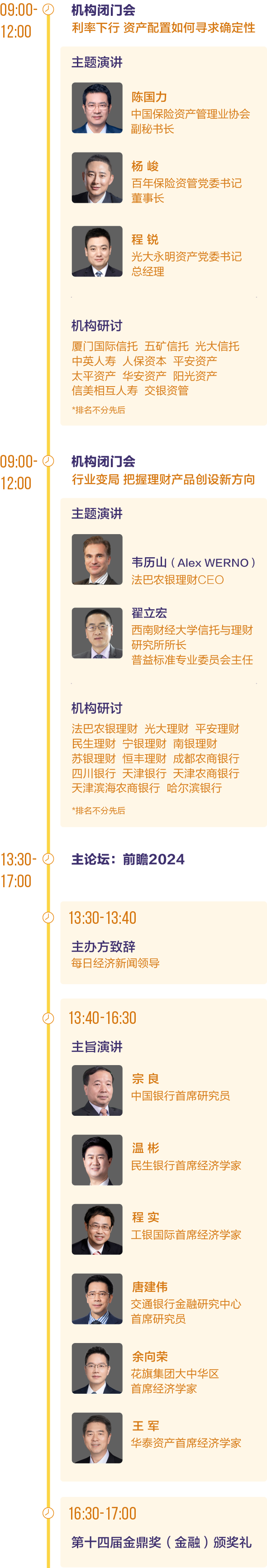 第十四屆中國(guó)金融發(fā)展論壇暨金鼎獎(jiǎng)(金融)頒獎(jiǎng)禮將于12月6日在北京隆重舉行。主論壇以“前瞻2024”為主題匯集頂級(jí)金融機(jī)構(gòu)的研究成果,就2024宏觀經(jīng)濟(jì)金融形勢(shì)進(jìn)行分享。分論壇聚焦金融機(jī)構(gòu)資產(chǎn)端和產(chǎn)品端兩大細(xì)分領(lǐng)域,邀請(qǐng)相關(guān)機(jī)構(gòu)業(yè)務(wù)負(fù)責(zé)人展開(kāi)閉門(mén)研討。